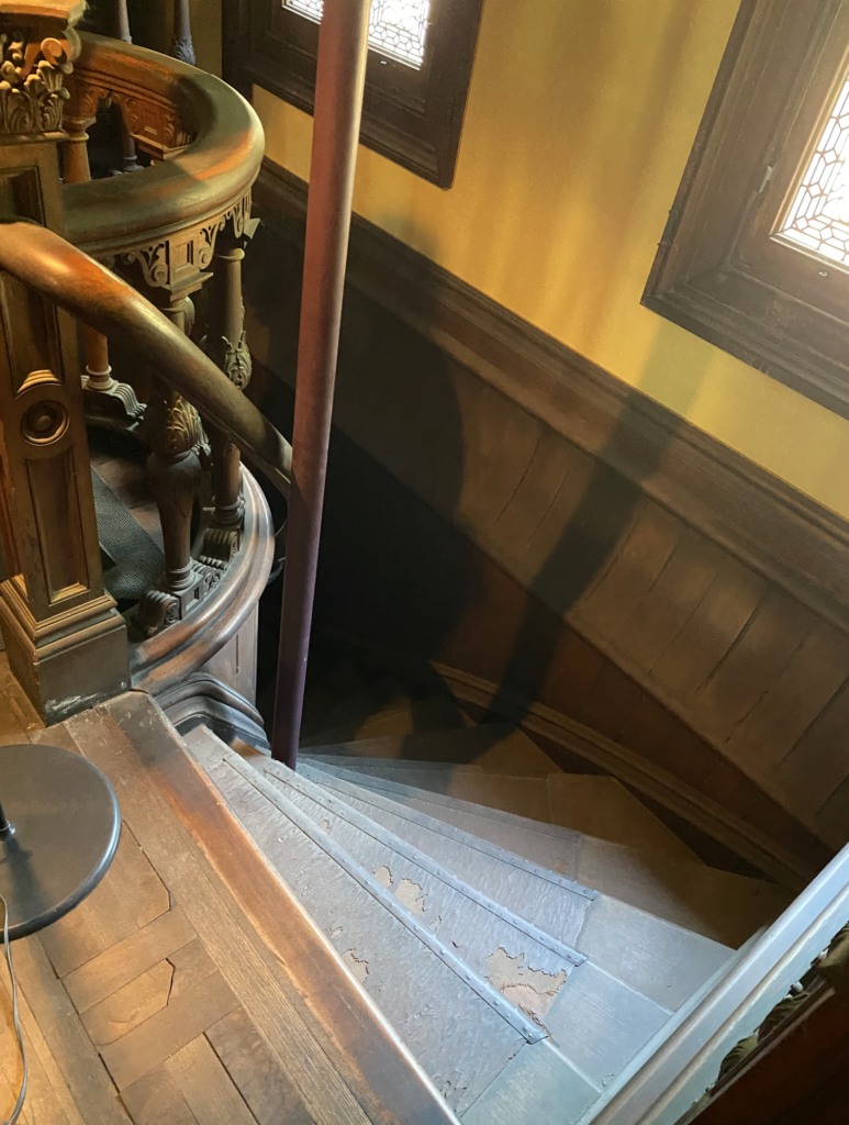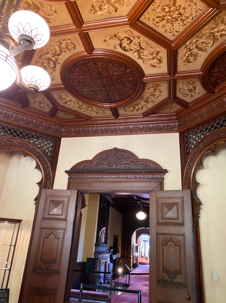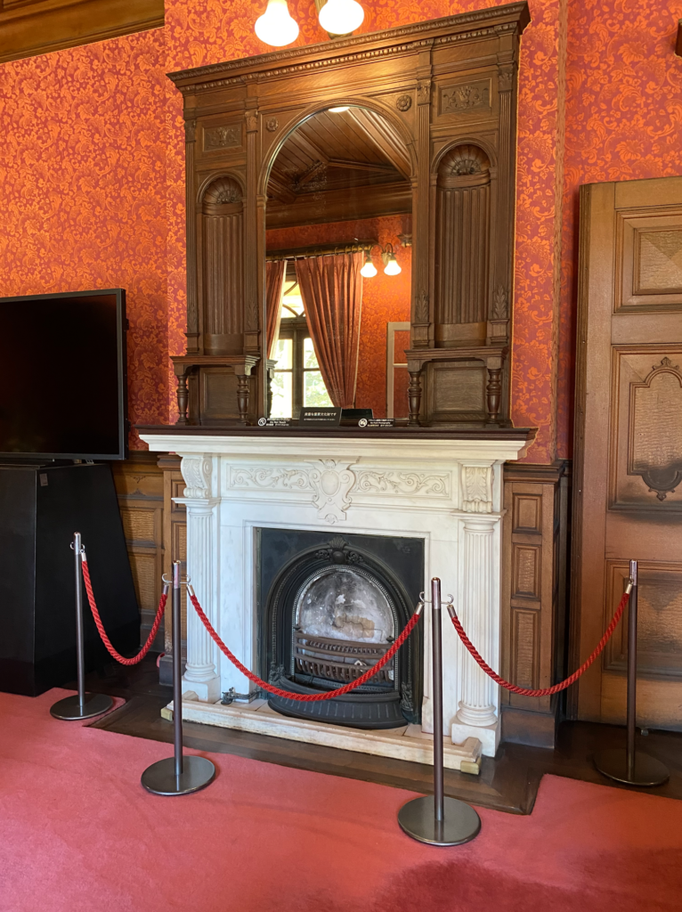 パーティーの時、まずホールに集まり、最重要女性の手を主人がとって食堂に入る。その場では、男女の話題や政治、下ネタ禁止のレディ&ジェントルマンの時間。終わると、男女が分かれ、女性はおしゃべり、男たちはビリヤード室に向かう。そこでは言いたい放題の場となる。そんなビリヤード室は、スイスの山小屋風であり離れ茶室の趣で、デザイン的な調和としては巧みなバランスというか、トンチンカンにも感じる。ビリヤード室前面に列柱のベランダがあるが、寒いヨーロッパでは、ベランダは造らない。スイスの山小屋にも無い。インドや東南アジアで生まれた植民地的なもの。洋館の列柱にしても腹巻を巻いたようなデザインは中世のルールを逸脱。エリザべサン様式、ジャコビアン様式、イスラム風な天井など。イスラム風は普通喫煙室につかう。やりたい放題のごちゃまぜ洋館。コンドル先生も晩年の祝賀パーティーで「日本はヨーロッパと一緒になって新しい文化を創っていく。真ん中にイスラムがある。自分は架け橋となる」と釈明している。笑。和館の完成度は高い。和館は念仏喜十ってあだ名の棟梁に造らせた。工事しながら「南無阿弥陀仏」って念仏を唱えていたようだ。床の間の絵で、真正面が富士山は正面性の強い、しっかりした絵で素晴らしいが、珍しい。大抵は、左右どちらかにずらす。広間は、三間四方の9坪の「九間(ここのま)」、面会や法事の折にはお坊様をまず九間に通す大事な部屋。でも一時期、アメリカ軍人の諜報機関が使っていた。地下に拷問室があったようだ。銃声も聞こえ手荒く使っていた可能性が高い。GHQが去った後は、空き家放置され和館はぼろぼろだったようだ。和館は風格のあるすっきりとした上品さ、格式ある空間造りはさすが念仏喜十。