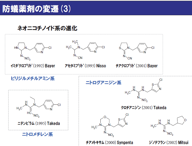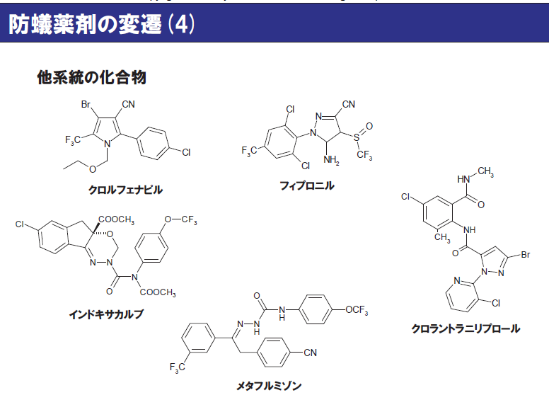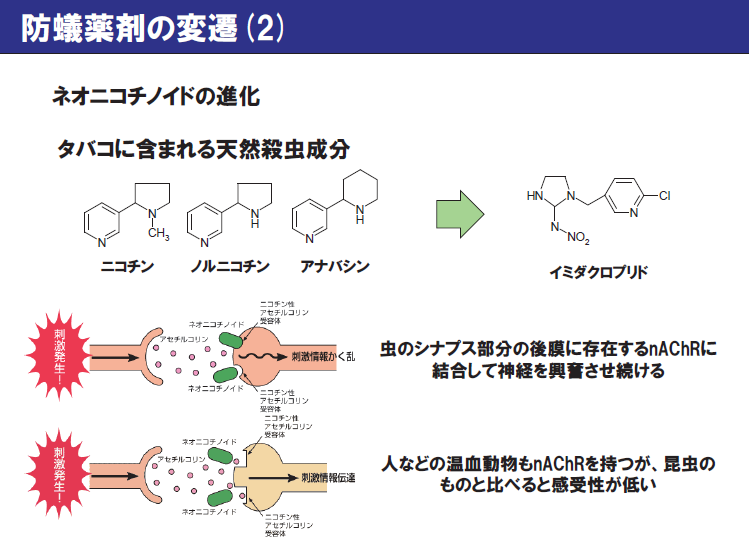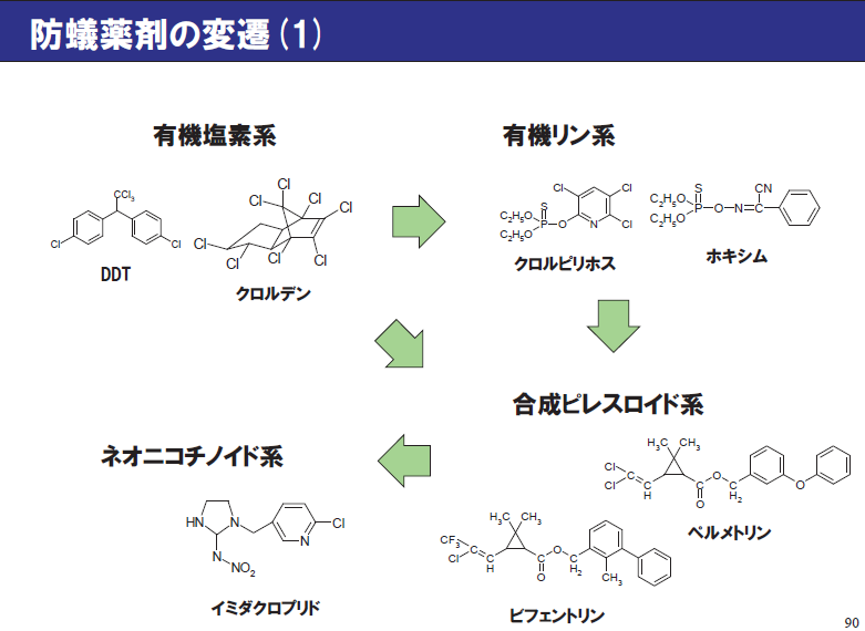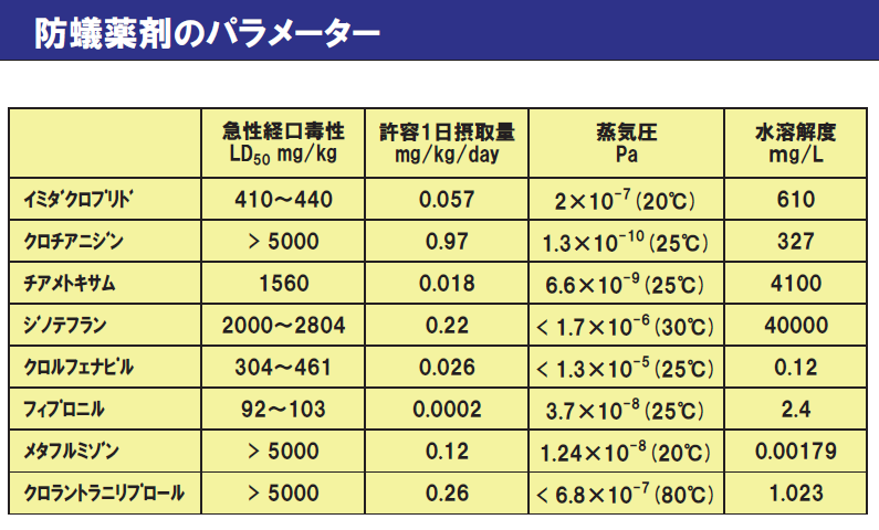 マイクロカプセルのものを使うとよい。ピレスロイド系は除虫菊系、ネオニコチノイドはたばこ系