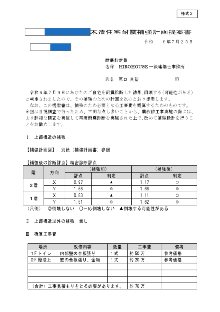 2:補強計画提案書(補強して評点1.11:一応倒壊しない。) ※計算プログラムは省略