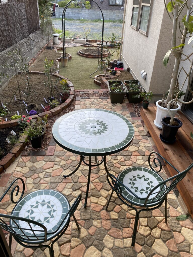 芝生TM9が来ました。絨毯みたいでとても良いです。ホームセンターのは枯れていましたけど緑です。。極力目地が通らないように互い違いに張っていきます。張り終えたら目地に目砂をまいて完成です。根が活着するまではできるだけ歩かない方が良いといいます。芝とレンガの見切りもいい感じです。リビング前のテーブルを置くテラスの床、結局は機能性重視で石調の敷物を敷き詰めました。きりのよいところでレンガで見切り、余地にはレンガを砕いたクレイチップを入れました。この場所が船上で、芝生は海、植栽は島といったイメージです。テーブルが入ると何となく庭らしくなってきました。枕木もいれました。10年はもつとのこと。先々、キシラデコールでメンテナンスが必要ですが、質感は良いです。腰掛けと観葉植物の置き場です。鋳物のテーブルと椅子は普段は花台です。鋳物も良いですね。いよいよ、樹木が入ってきます。続く…