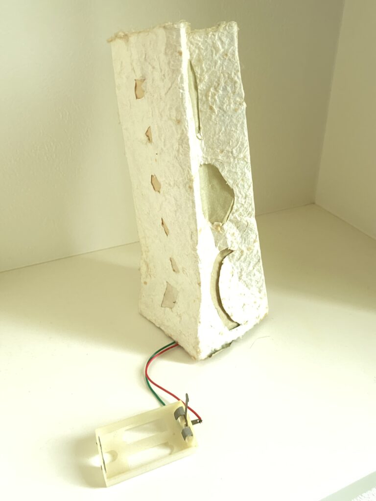 作品名「重力推進一石船」人力でクランクペダルを漕ぐと、水力タービンがゆっくりと力強く回転し、重い石舟が海面を走り、やがて空中へ漕ぎい出る光景を想像した作品です。2020.11.28