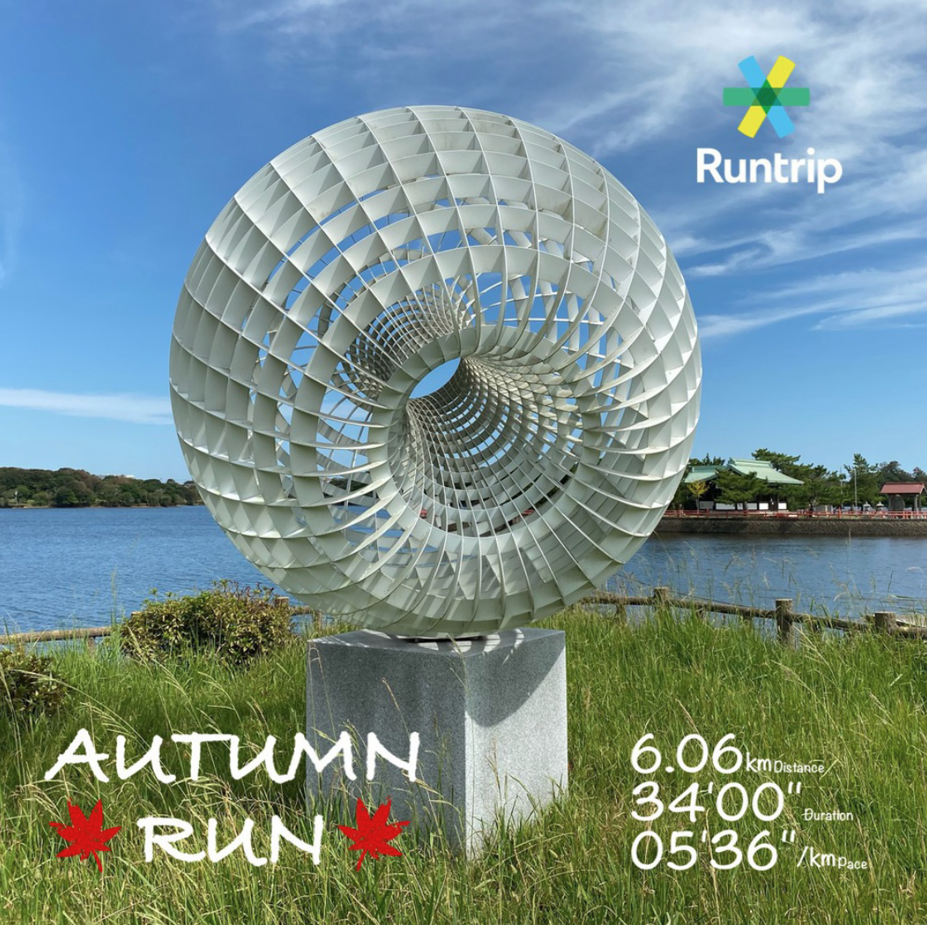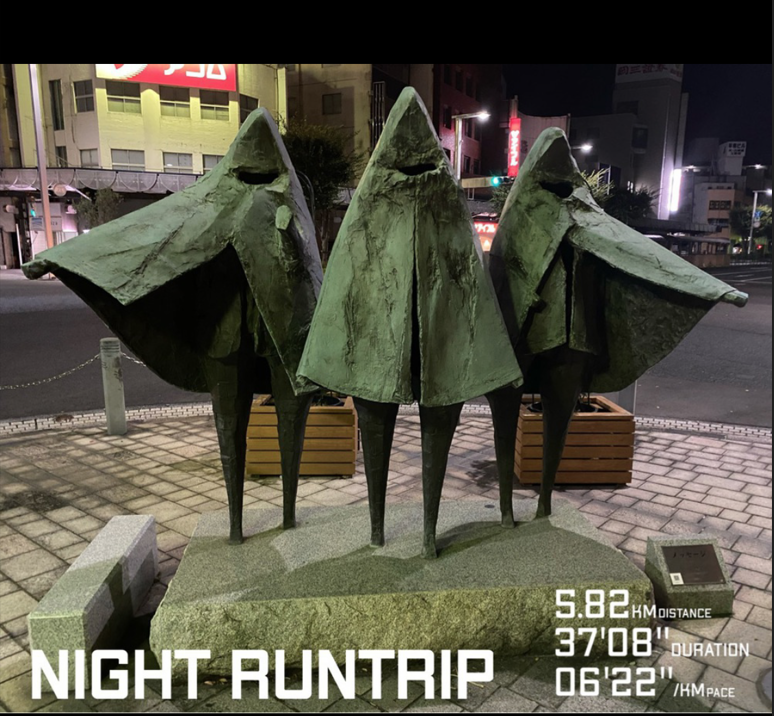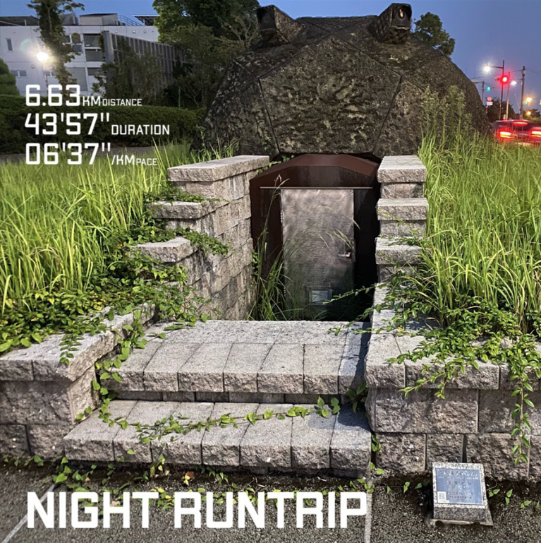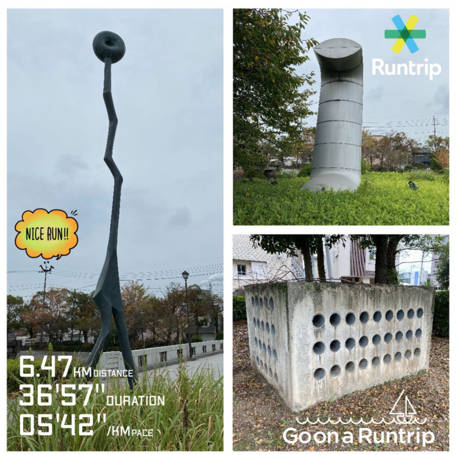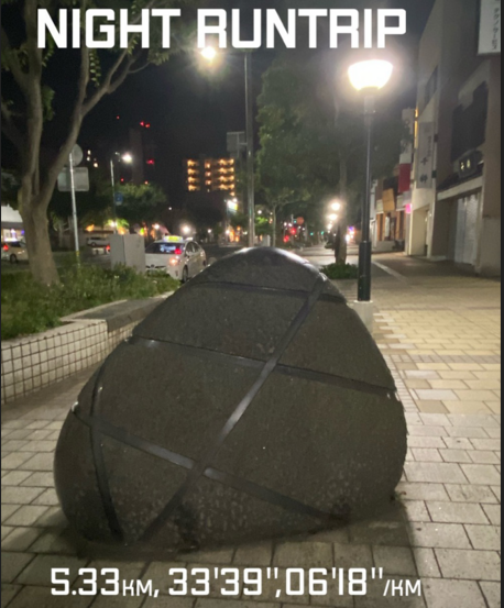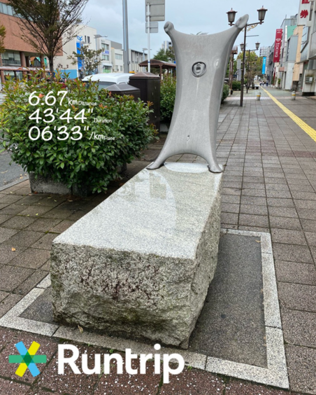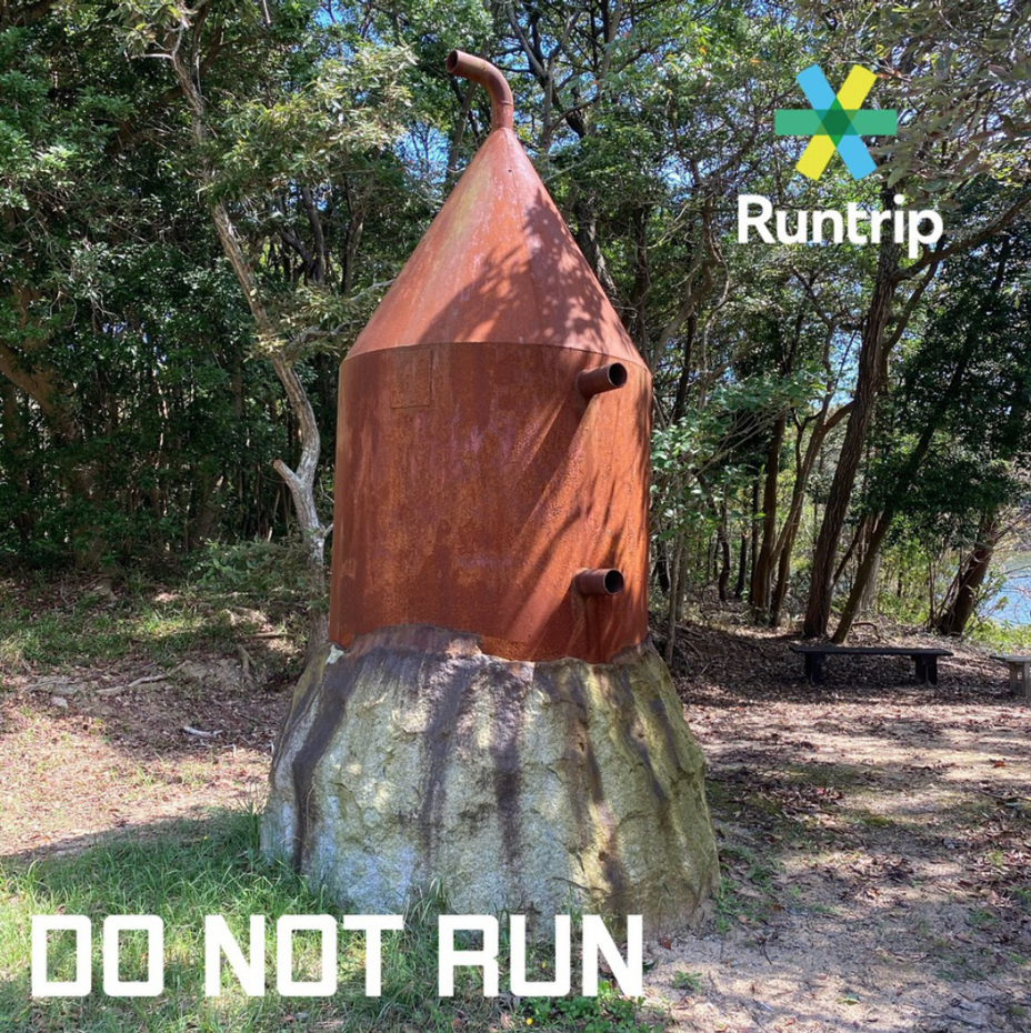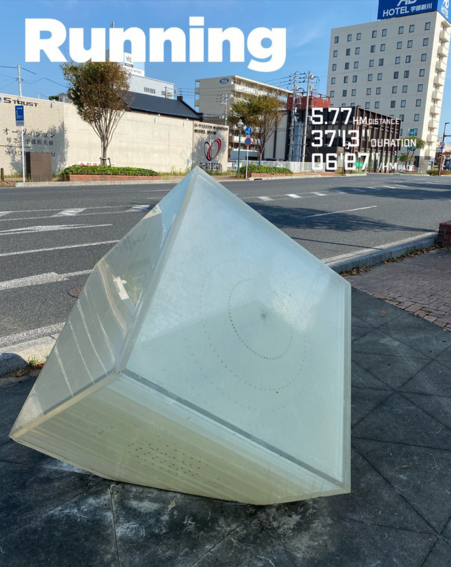 作品名「縛られたピラミッド」歩道に突然 隕石が!ぶつかるところでした。笑い。Runtripを偶然見つけて、走ることのモチベーションが上がりました。これまで一人で土日に走るくらいでしたが、皆で一緒に走っている気分になれます。2020.8.26
