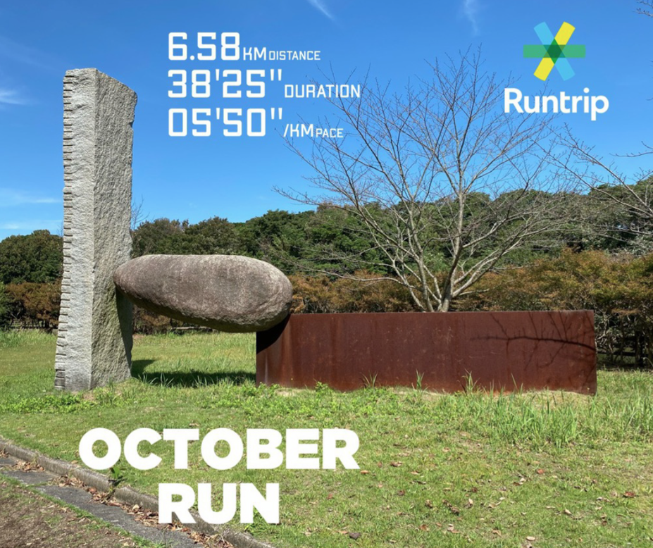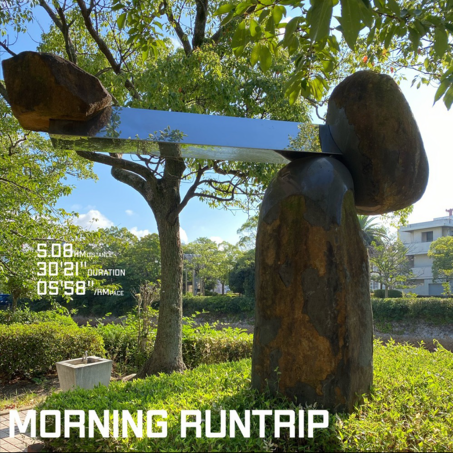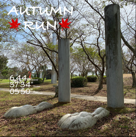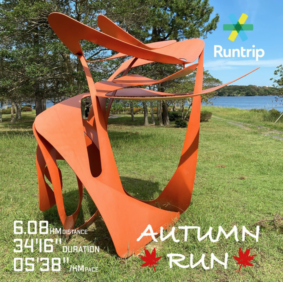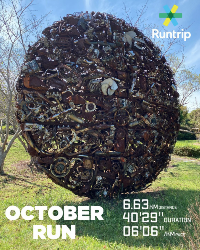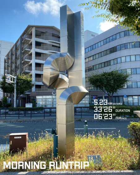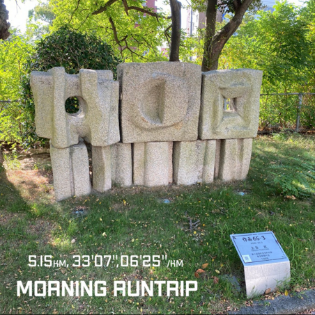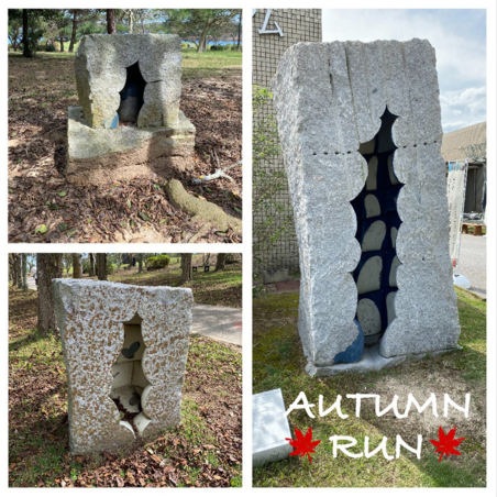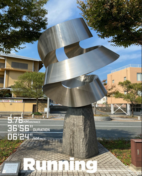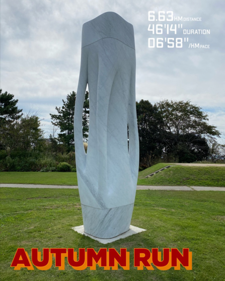 作品名「浮く石」更に走っていくと、浮いている石が!点で接しているように見えるけど、どうやって浮かせているんだろう。こういったマジシャン的な彫刻もたまに見かけます。半重力的作品ですね!今日は、お尻の筋力を使って着地の反発を利用し、前に出ることを意識して走りました。夏の走り込みの成果が出てきているのを感じました!続けられるかが課題です!😊2020.10.11