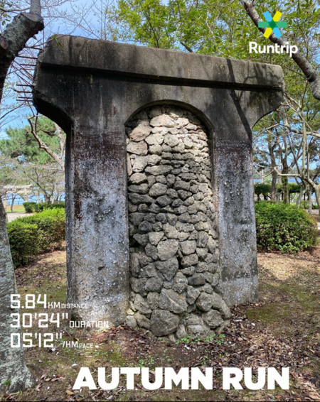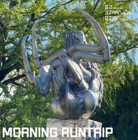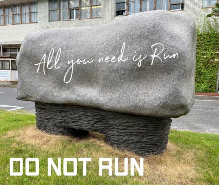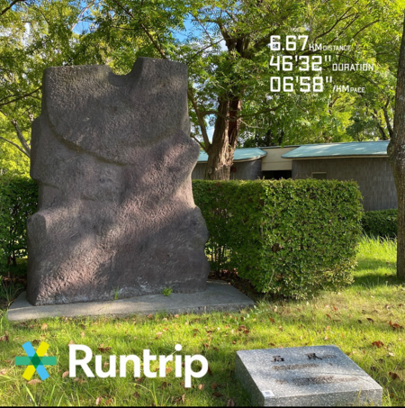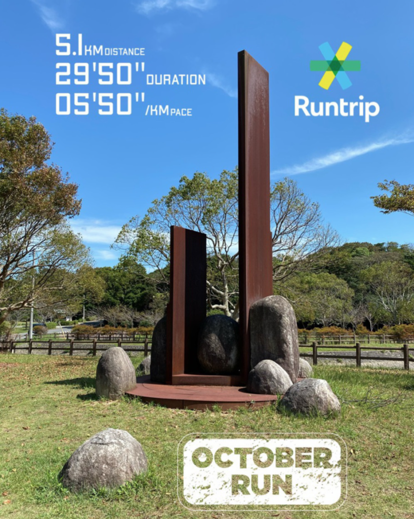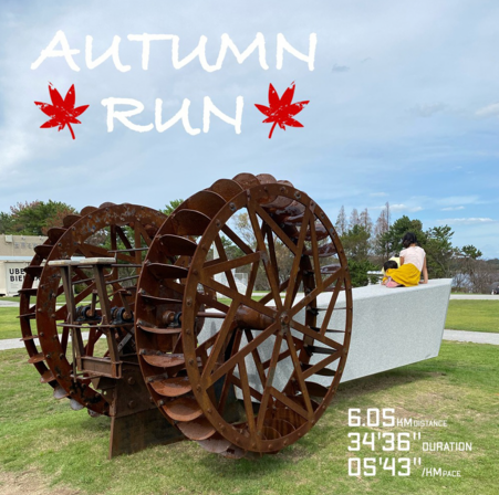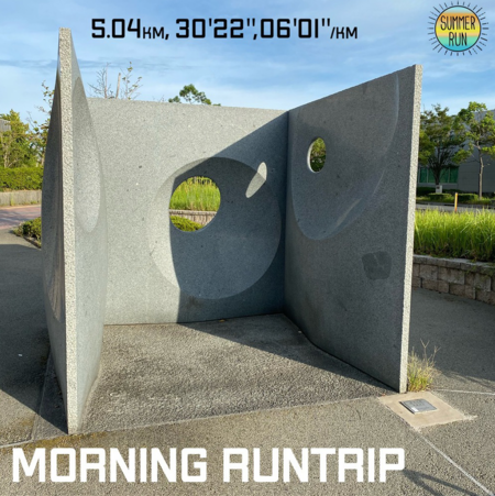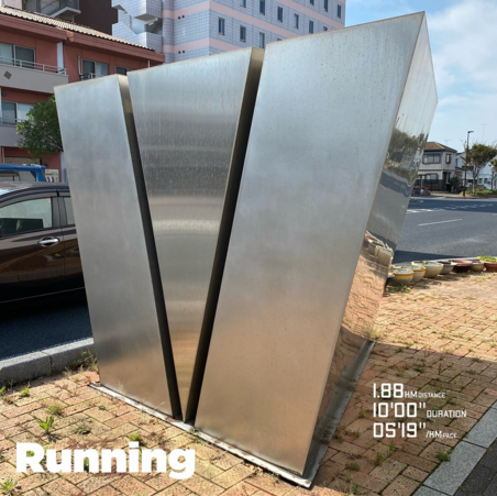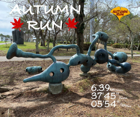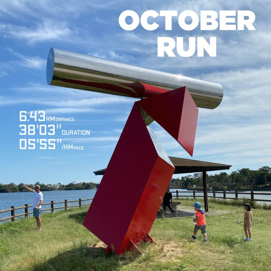 作品名「浮く石」更に走っていくと、浮いている石が!点で接しているように見えるけど、どうやって浮かせているんだろう。こういったマジシャン的な彫刻もたまに見かけます。半重力的作品ですね!今日は、お尻の筋力を使って着地の反発を利用し、前に出ることを意識して走りました。夏の走り込みの成果が出てきているのを感じました!続けられるかが課題です!😊2020.10.11