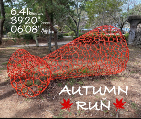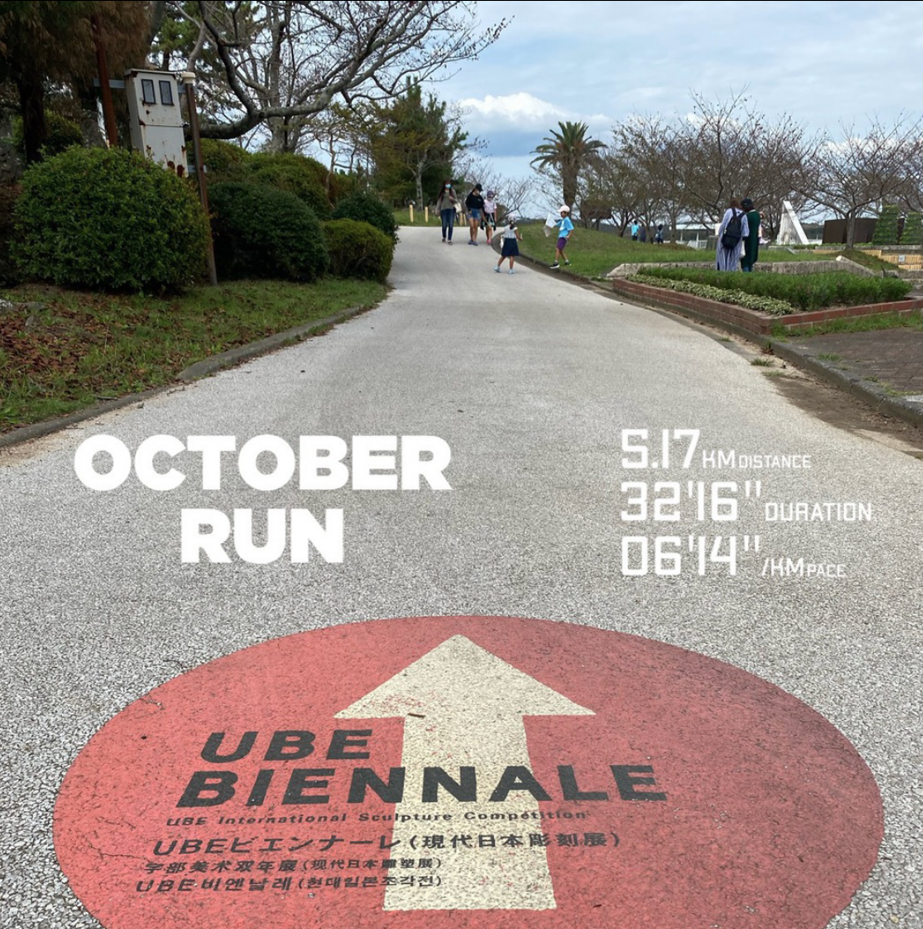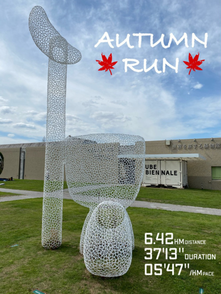 🍃「UBE BIENNALE」いよいよ、現代彫刻の本拠地、常盤公園を🏃‍♂️走ります。🌳湖と緑と彫刻、子連れの親子に気持ちが癒され、途中、吊り橋を渡り、林も駆け抜け、距離は6km弱。大好きな超お勧めランニングコースです。最近、仕事に全力疾走していた、5日間走れていませんでした。今日の走りはじめは、手と脚に体がばらばら、自分のフォームを完全に忘れていました。でも、段々とリズムが取れてきて、後半は大分よくなりました。やっぱり走らなきゃ。明日も走ります!2020.10.3