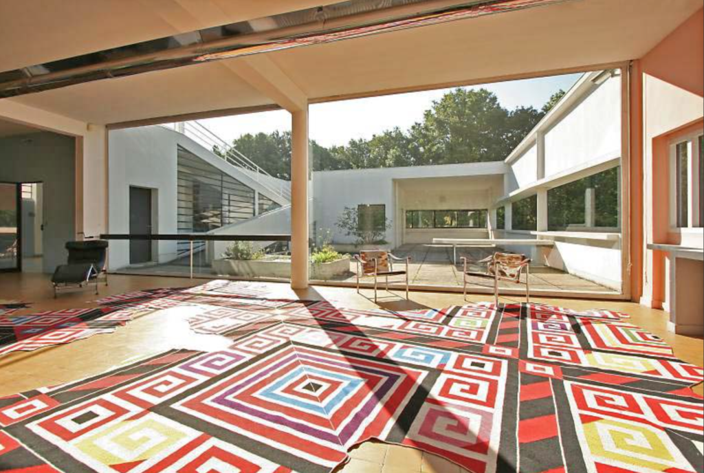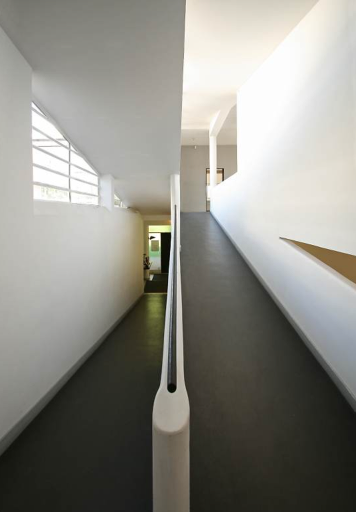 自然豊かな緑の森の中で、庭園付きの建物がそのまま持ち上げられて空中浮遊しているという感動。陸地という外部空間から持ち上げられたプライベート空間の中にも外部空間があり、部屋の中から見るとみごとに一体化しているところにも感動。西洋は石造壁の文化であり、そのために縦長の窓になってしまう。だが、これは違う、RCラーメン構造だ、梁が見えない2重の床スラブになっているのでシンプル。しかも柱を壁の内側に隠したキャンティレバー(片持ち)だ。壁は構造体でないから、自由に横長につながる窓がつくれたのだ。ダイナミックなデザイン。それにしても細い柱だ。幾何学的だし。そんな風に感じていました。有名すぎる建物なので、解説は他に任せるとして、その空間を紹介しておきます。椅子も有名です。